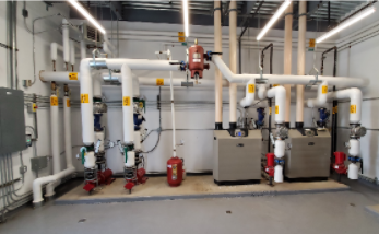 Heating is supplied by two High Efficiency Slim Fit Condensing boilers. Heating water is dispersed throughout the building with a series of piping and pumps. VAV boxes in each room and commons areas, allows residents to maintain space temperature individually.