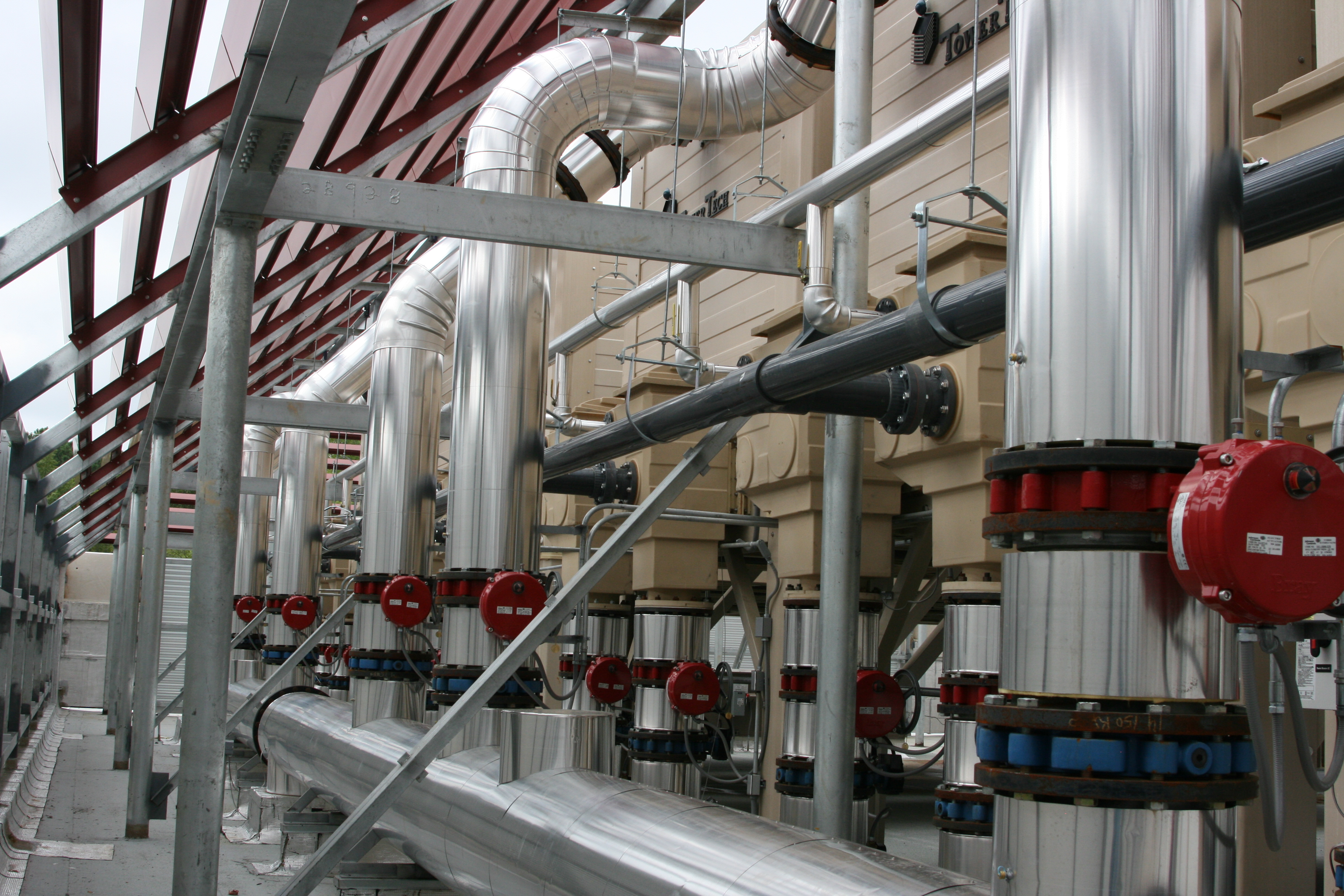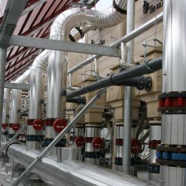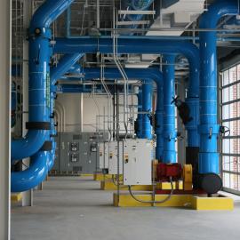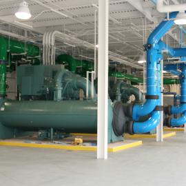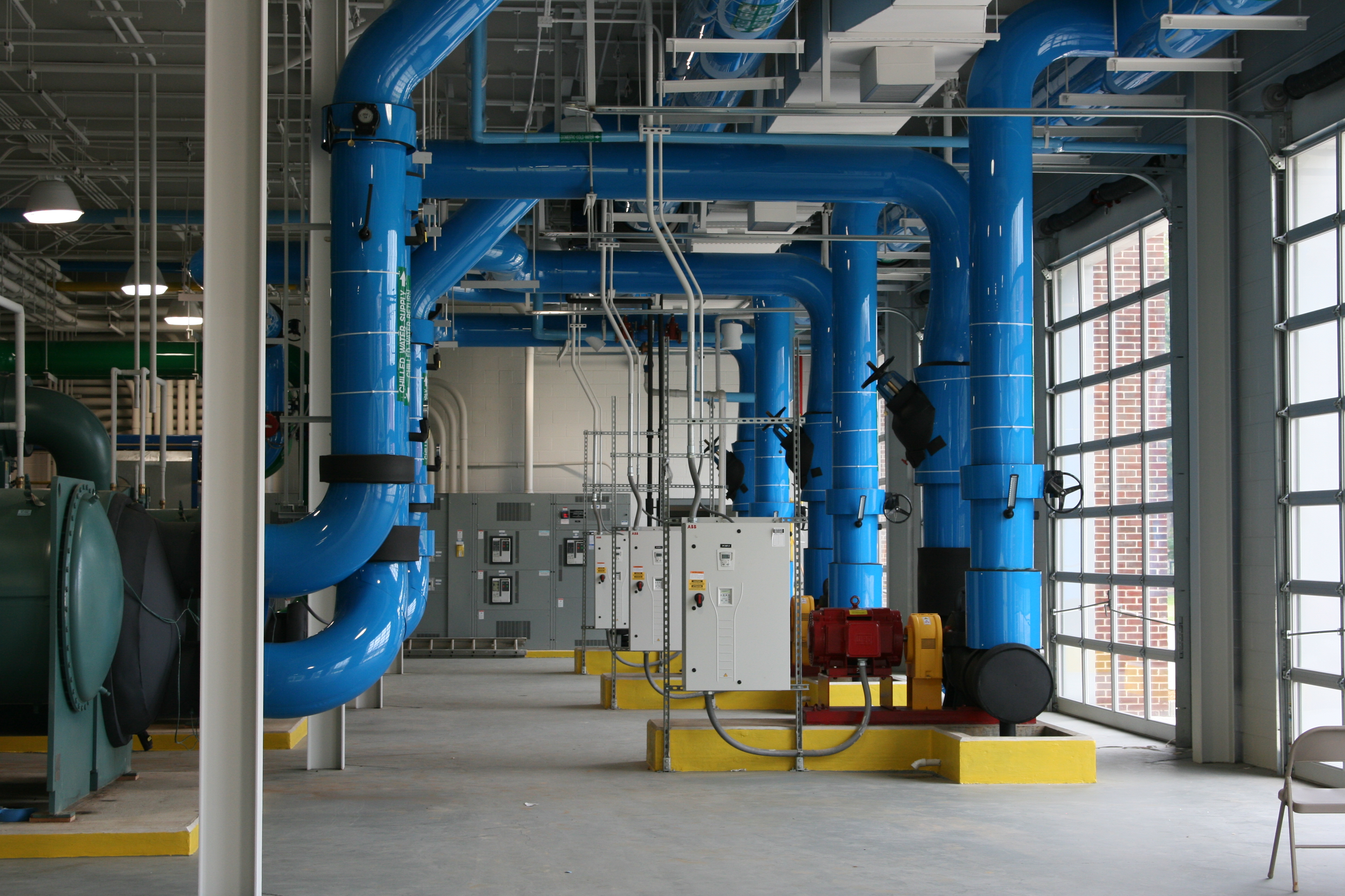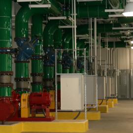 Project Scope: The 11.4 million dollar Central Mechanical Plant serves the University's chilled water quadrants via 30-inch chilled water mains and 18 inch heated water mains. The project included a new building that houses two 1,400 ton water-cooled chillers, one existing 1,000-ton chiller, one 2,000 ton plate/frame heat exchanger, eleven horizontal split case pumps, and has room for an additional 1,400-ton water-cooled chiller and pumps, which will provide the cooling capacity for the ice storage system. The boiler room houses six 6,000,000 BTUH input condensing boilers, pumps, and enough space for two additional boilers and pumps. The roof of the building supports six 900 Ton Towertech cooling towers, hidden from view by screen louvers that allow for adequate free airflow. There is space for maintenance staff, workstations, tool room, equipment repair bench, and emergency dispatch staff. The design of the CMP attempts to mitigate the imposing nature of a massive mechanical plant. The location of the building forced the designer to consider human scale and find the appropriate balance of functional requirements with the campus's formal and aesthetic precedent. Exterior materials match those of adjacent, existing structures in an effort to fit within the existing fabric. The enclosed walls are brick-faced, concrete block cavity walls with damp-proofing and rigid insulation in the air space and cast stone accents. The roll-up glass doors present the mechanical equipment as if on display for viewing by students and patrons.